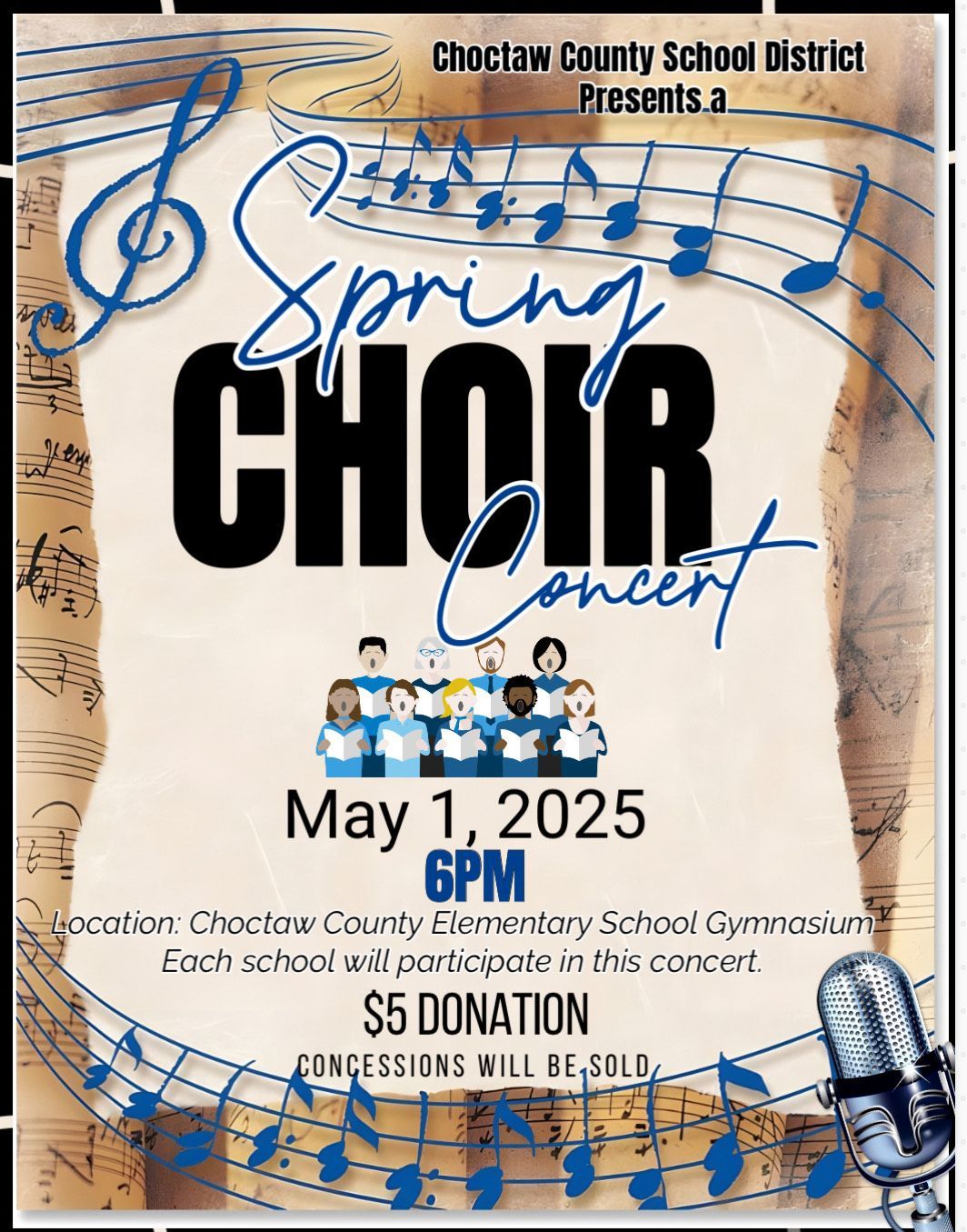 The Choctaw County School District proudly presents its Spring Choir Concert on May 1, 2025, at 6:00 PM, hosted in the Choctaw County Elementary School Gymnasium. Enjoy an evening of music as students from each school come together to showcase their talent and hard work.